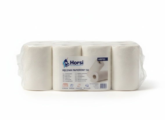 Ręczniki papierowe Horsi (12 rolek x 50mb) – 100% celuloza, 2 warstwy. Wysoka chłonność i miękkość. Wysokość 120mm. Idealny, ekonomiczny wybór do domu i biura.