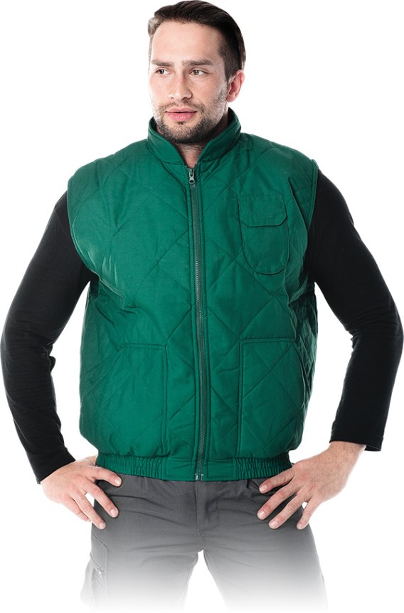 Bezrękawnik ocieplany pikowany. powłoka 65% poliester, 35% bawełna wyściółka 100% poliester o gramaturze 180 g/m2 podszewka 190T poliester taffta zapinany na suwak pikowanie zabezpiecza przed przesuwaniem się ociepliny po z