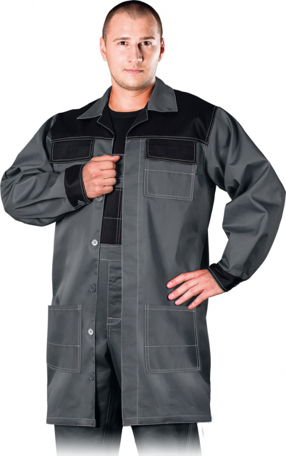 Fartuch ochronny Multi Master. 65% poliester, 35% bawełna gramatura 262 g/m2 zapinany na guziki dwie boczne kieszenie idealny do pracy m.in. w zakładach ślusarskich, jak również na magazynach modne połączenie kolorów nadaje