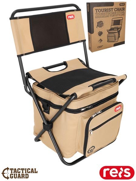 Składane krzesło turystyczne z oparciem 2w1, wykonane z poliestru 600x300D i stali. Maksymalna wytrzymałość 110 kg, torba pod siedziskiem z kieszonkami i paskiem do przenoszenia. Idealne na biwak, kemping i wędkowanie.