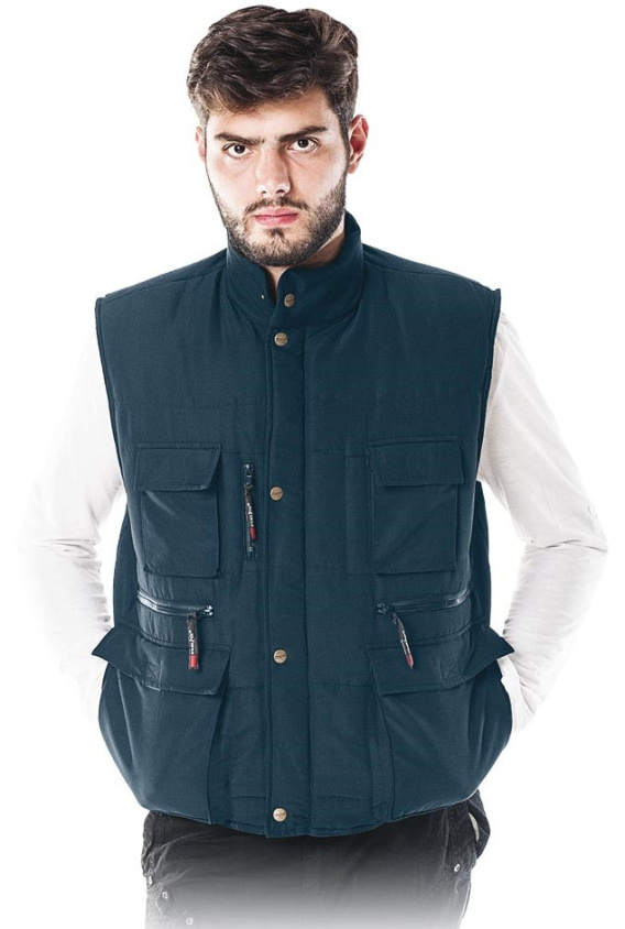 Bezrękawnik ocieplany z dużą ilością kieszeni. - powłoka 100% poliester - wyściółka 100% poliester o gramaturze 180 g/m2 - podszewka 190T poliester taffta - zasuwany z dodatkowym zapięciem na napy - przedłużany tył - liczne kieszenie m.in. dwie kies