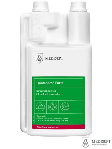 Koncentrat do mycia i dezynfekcji Quatrodes® Forte – wyrób medyczny i produkt biobójczy. Skutecznie eliminuje wirusy, bakterie i grzyby. Nie wymaga spłukiwania, nie zawiera aldehydu ani fenolu. Idealny do sprzętu medycznego i powierzchni mających kontakt z żywnością.
