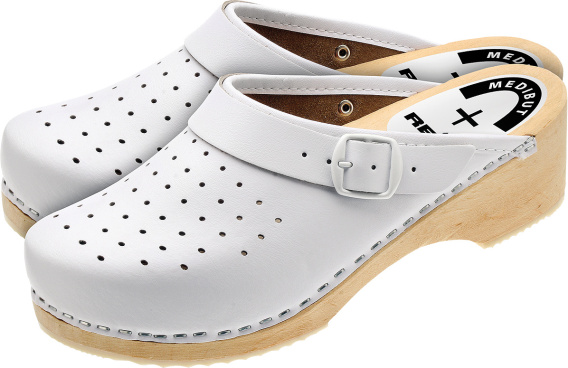 Pantolety zdrowotne (drewniaki). spód drewniany z profilem ortopedycznym cholewka z perforacją wykonana ze skóry naturalnej z powłoką odporną na mycie pasek dwufunkcyjny przekładany na piętę podeszwa przeciwpoślizgowa odporna na oleje, tłuszcze roślin