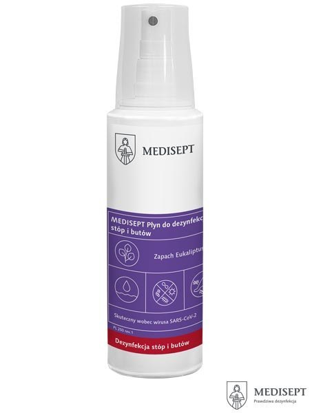 Płyn do dezynfekcji stóp i butów MEDISEPT (250 ml z atomizerem) o zapachu eukaliptusa. Działa bakteriobójczo, drożdżakobójczo i wirusobójczo (Rota, Noro). Skuteczny przeciw grzybicy w 30/60 sek.