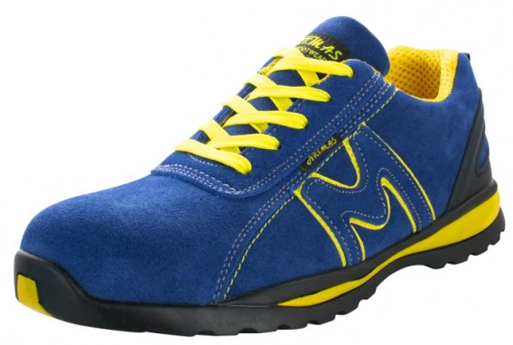 Buty robocze: półbut ochronny o atrakcyjnym sportowym wzornictwie, wykonany ze skóry dwoinowej, zamszowej, w kolorze granatowym, ze stylowymi aplikacjami w kolorze żółtym, stalowy podnosek.