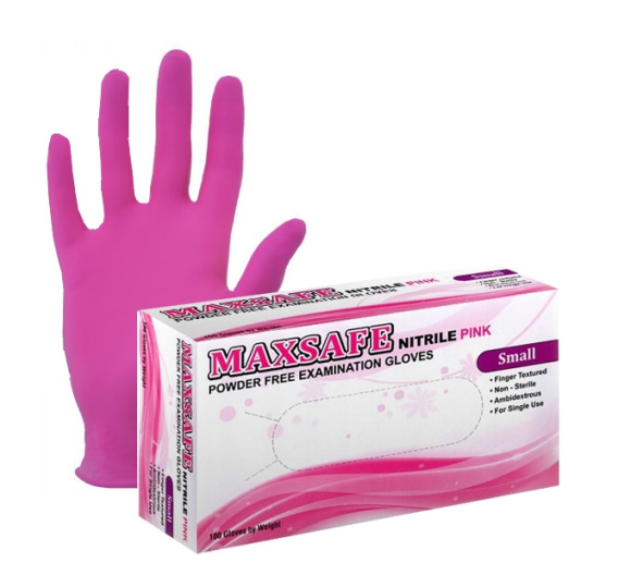 Rękawice diagnostyczne MaxSafe w różowym kolorze - rozmiar S. Wykonane z wysokiej jakości nitrylu, nie zawierają pudru oraz lateksu. Są niesterylne. Rękawiczki bardzo przyjazne dla skóry.