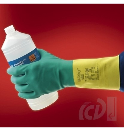 Rękawice ochronne ANSELL Bicolour wykonane są z naturalnego lateksu, pokrytego neoprenem. Przeznaczone do pracy z kwasami i ługami, czyszczenia i konserwacji, prac laboratoryjnych. Rękawice ANSELL Bicolour zapewniają pełną ochronę chemiczną zgodnie z EN3