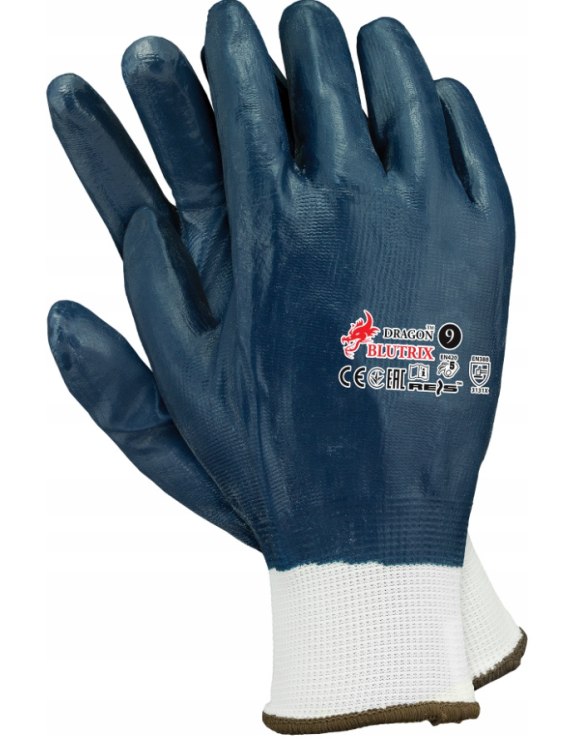 Rękawice ochronne powlekane nitrylem, zakończone ściągaczem, część wierzchnia i chwytna oblewana powłoką z nitrylu w kolorze granatowy.