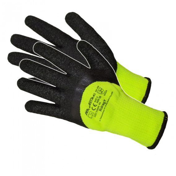 Rękawice ochronne, ocieplane, dziane, bezszwowe, w kolorze żółtym fluorescencyjnym, wykonane z dzianiny frote. Powleczone szorstkowanym lateksem w kolorze czarnym.