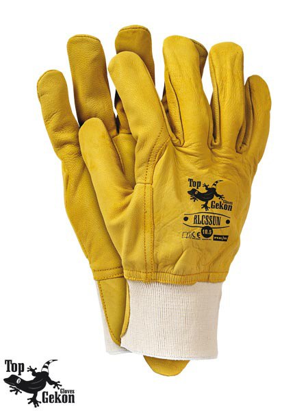 Rękawice ochronne wykonane ze skóry w żółtym kolorze - skóra kozia licowa - całodłonicowe - część chwytna rękawicy wykonana z jednego kawałka skóry, dzięki czemu wykazują większą wytrzymałość i odporność na przetarcia - całoskórzane, czyli w całości