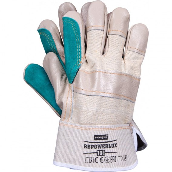Rękawice ochronne wzmacniane skórą licową w jasnych kolorach, mankiet usztywniany kauczukiem.