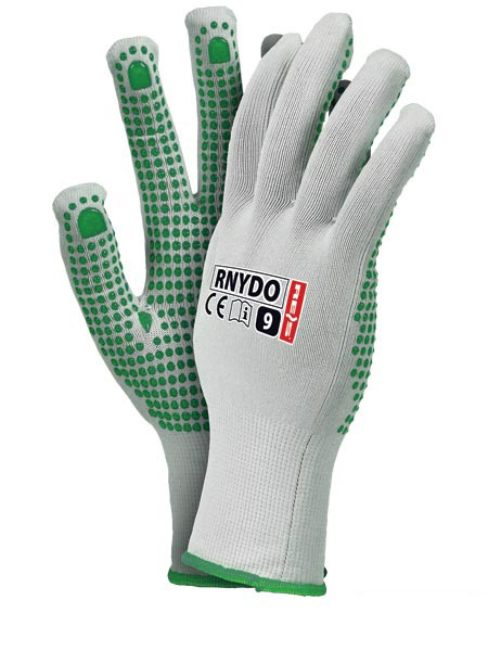 Rękawice z nakropieniem PCV na części dłonicowej, zakończone ściągaczem.