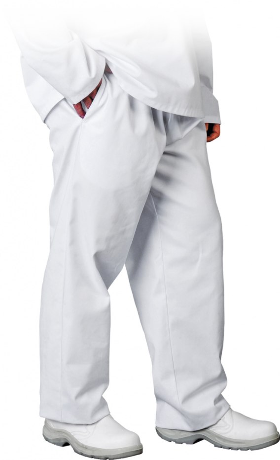 Spodnie ochronne do pasa. 65% poliester, 35% bawełna gramatura 210 g/m2 przystosowane do pracy w systemie HACCP (przemysł spożywczy) kieszeń od wewnątrz spodni z prawej strony rozciągliwa gumka w pasie pozwala lepiej dopasować rozmiar odpowiednie do