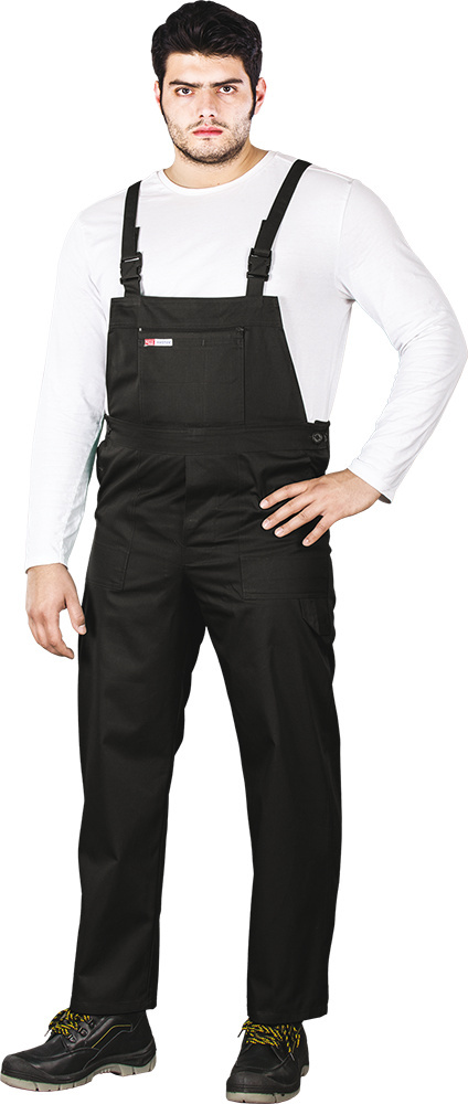 Spodnie ochronne ogrodniczki typu Master. - 65% poliester, 35% bawełna - gramatura 262 g/m2 - możliwość regulacji w pasie dzięki dodatkowym guzikom oraz w długości szelkami, które to dodatkowo mają w tylnej partii gumkę - dwie boczne kieszenie oraz je