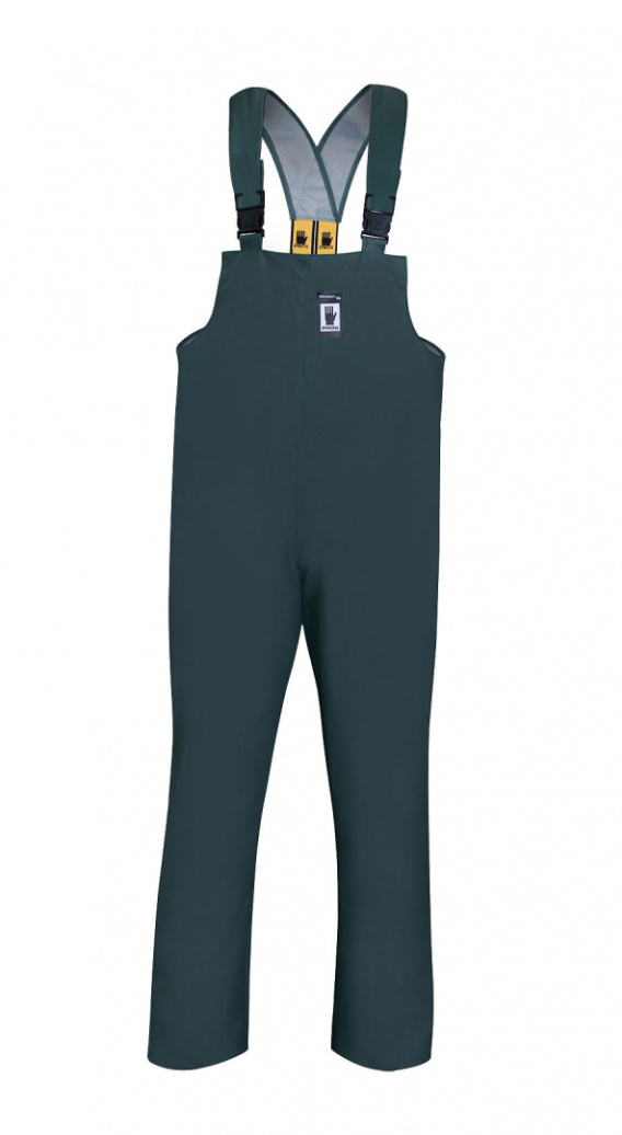 Spodnie ogrodniczki z regulowanymi szelkami z elastyczną, szeroką gumą z tyłu. Model produkowany z wodoochronnej tkaniny Plavitex, przeznaczony do użytku w niesprzyjających warunkach pogodowych. Zapewnia skuteczną ochronę przed wiatrem i deszczem. Techni