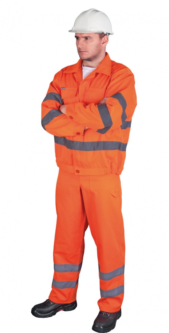 Ubranie ostrzegawcze składające się z bluzy i spodni ogrodniczek. - fluorescencyjna tkanina: 86% poliester, 14% bawełna - gramatura 300 g/m2 - w dolnych partiach kurtki, rękawów i spodni znajdują się odblaskowe pasy, które zapewniają dobrą widoczność u