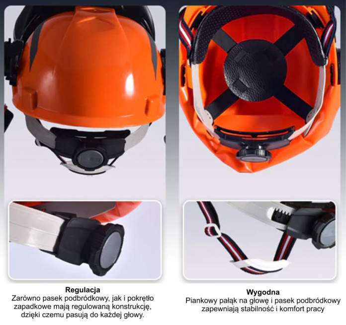 Kask został zaprojektowany tak, aby zapewnić wygodę noszenia dla każdego użytkownika. Dzięki regulowanemu paskowi podbródkowemu i mechanizmowi z pokrętłem do zmiany rozmiaru, można go idealnie dopasować do każdego kształtu głowy. System regulacji umożliwia szybkie i łatwe dostosowanie kasku bez potrzeby zdejmowania go z głowy. W połączeniu z ergonomicznym designem, kask nie przesuwa się i nie powoduje dyskomfortu podczas wielogodzinnej pracy.